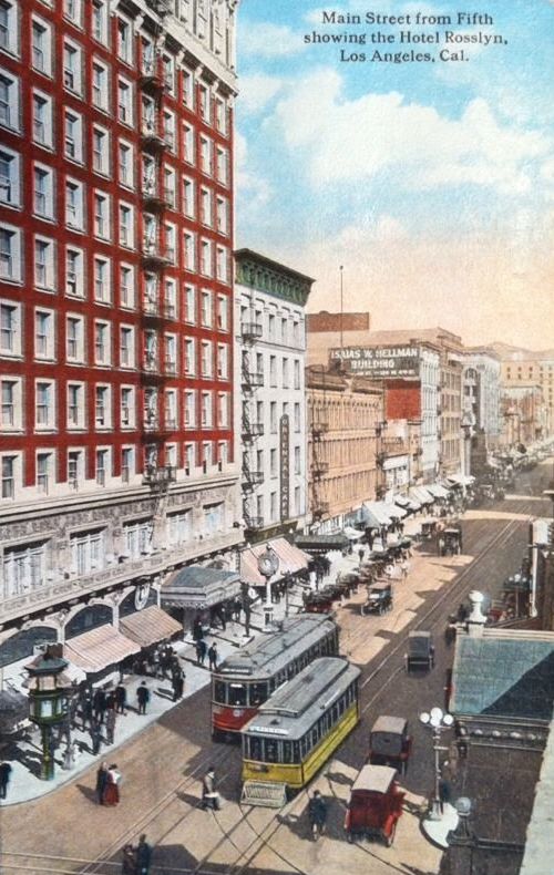 The Rosslyn Hotel “in the heart of Los Angeles” was a large tourist hotel consisting of two units- the main hotel and the annex on the northwest and southwest corners of Main and Fifth streets. My great-grandfather worked there as an electrician from 1914 to 1941.