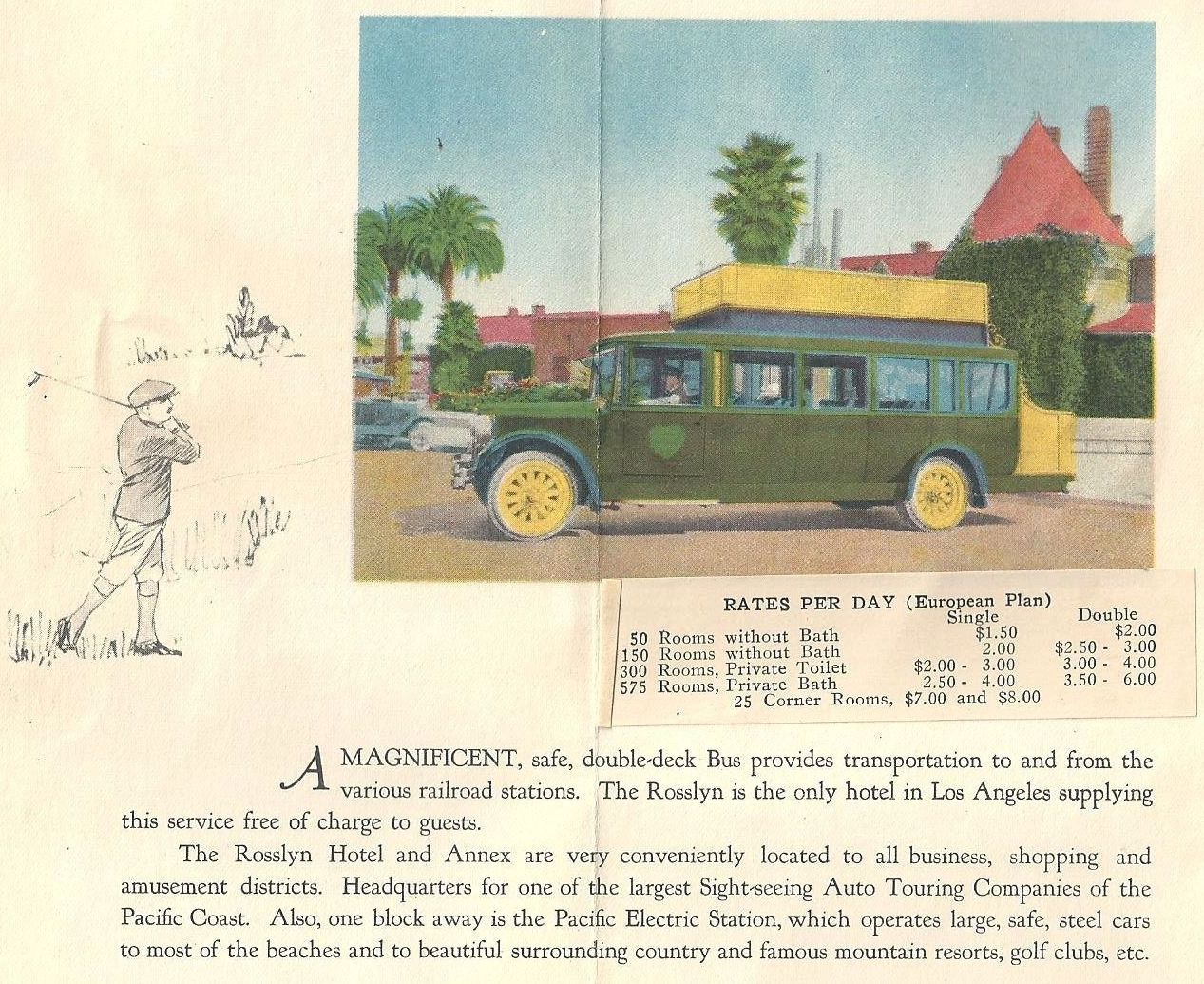 The Rossyln Auto Stage (aka a bus) shown here at the nearby Santa Fe’s La Grande Station, met all trains. The Southern Pacific depot was likewise only a couple blocks away.