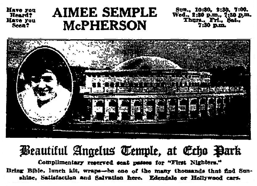 Aimee soon departed Los Angeles temporarily on a cross-country “vindication tour.” Though she continued to preach to packed houses in Echo Park, her days as a cultural phenomenon had passed. She died Oakland, CA on Sept. 27, 1944. Her son Rolf took over leadership of the church she’d founded.