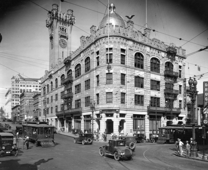 The Times was one of several daily papers in the city at the time, but could boast the largest circulation of them all. For the last few years its publisher was Harry Chandler, who took over after the death of his father-in-law Harrison Gray Otis in 1917. Designed by Walter E. Erkes (1884-1961), this was the third Times building. It replaced the 1886 structure at the same location that had been destroyed by a bomb in 1910. The battlement clock tower, with its 10-foot clock by Nels Johnson, was a downtown landmark.