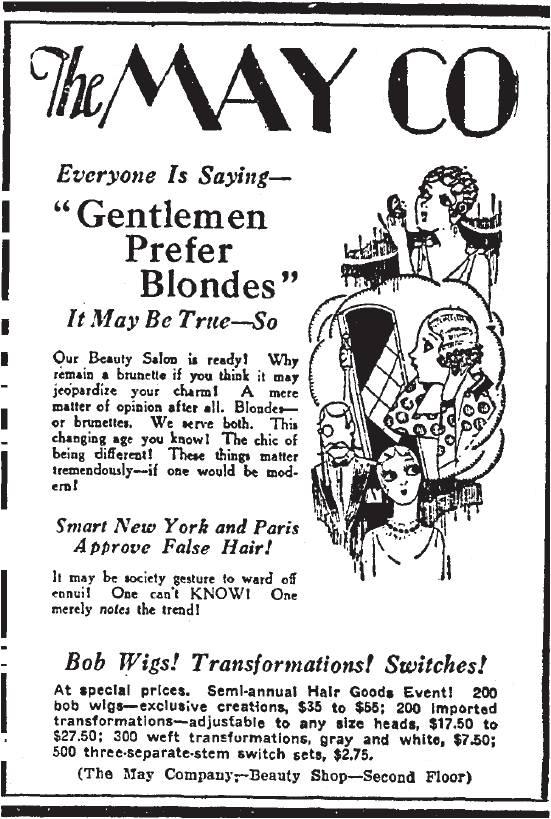 So gentleman prefer blondes, do they? Ad for the May Co.’s 2nd floor beauty salon, October 31, 1926. Brunette Anita Loos’ hit Broadway play Gentleman Prefer Blondes, based on her 1925 book of the same name, was to have its Los Angeles debut in November.