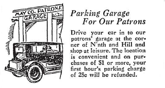 In the fall of 1926 the May Co. released plans for a new parking garage at 9th & Hill. Designed by Curlett & Beelman, it opened in 1927.