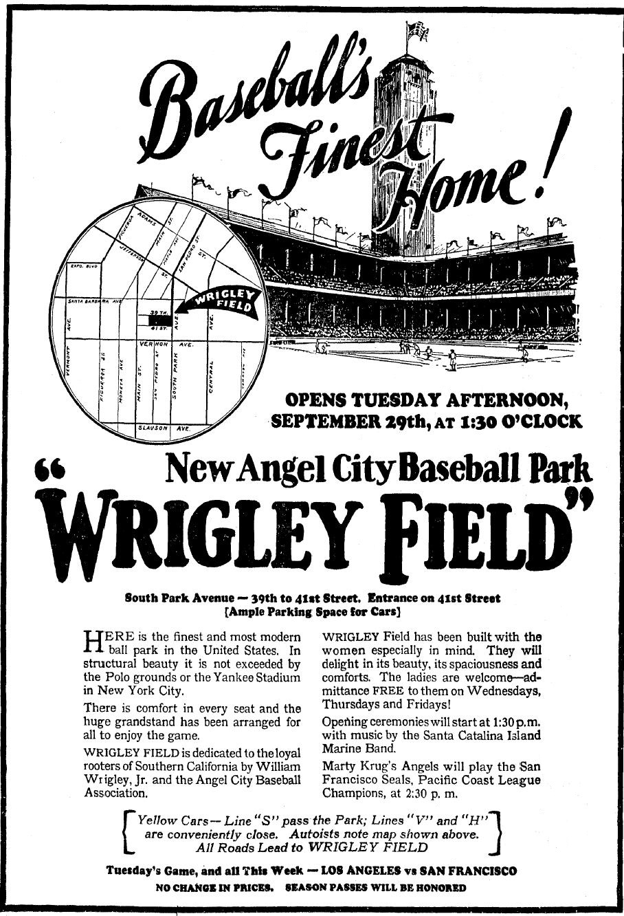 February 1925 saw the groundbreaking of the Angels’ new $1 million home, which, naturally, was called Wrigley Field. Bounded by Avalon Blvd., San Pedro, 41st St., and 42nd Pl. in the University Park neighborhood, the 21,000 seat stadium opened September 29, 1925. It was dedicated to the players who took part in World War I. The 50-piece Santa Catalina Island Marine Band played, Los Angeles Mayor George Cryer tossed out the first ball to Sheriff Traeger, and the Angels took on PCL champs the San Francisco Seals (The Angels won).