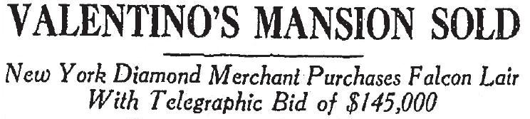 Only a year before his death, Valentino, having separated from wife Natacha Rambova, moved into a fabulous hilltop estate in Beverly Hills that he named Falcon Lair. It was sold at auction on December 10, 1926, ostensibly to pay off some of his debts. Jules Howard of New York was the successful bidder, paying a reported $145,000.