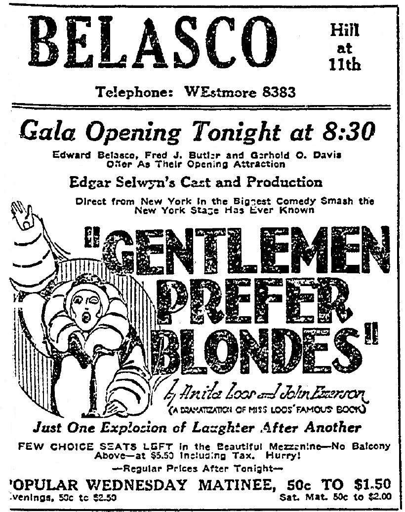 Belasco, like his counterpart A.L. Erlanger at the Biltmore Theater, was focused on bringing Broadway shows to the west coast simultaneously, or as nearly so as possible, with their Manhattan debuts. Based on Anita Loos’ 1925 book about the adventures of gold-digging flapper Lorelei Lee, Gentlemen Prefer Blondes opened at the Times Square Theater in New York only a little over a month earlier and was still enjoying a hit run. In the past Los Angeles had had to wait some time for shows to make it out west.