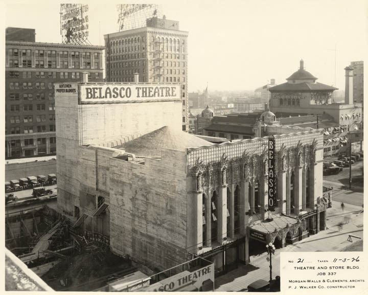 Construction of the new Belasco Theater Feb 1926. The Los Angeles Railway Building is behind it on Broadway; the tall structure under construction is the Commercial Club building (later Case Hotel). Across the street is William Randolph Hearst’s Los Angeles Examiner building. CSL collection