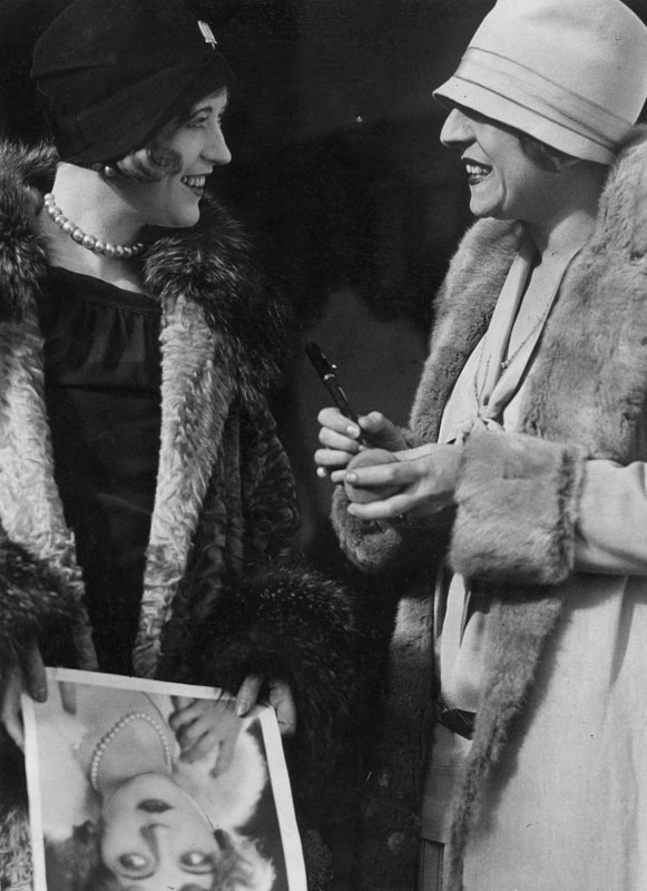 Movie goddess meets tennis goddess: screen actress Marion Davies presents Suzanne Lenglen with an autographed photo while Suzanne signs a tennis ball for Marion. December 1926. LAPL.