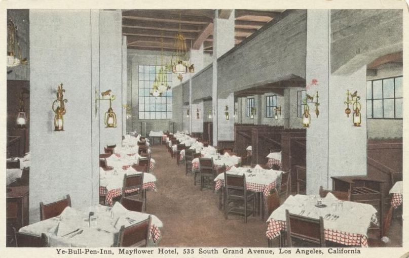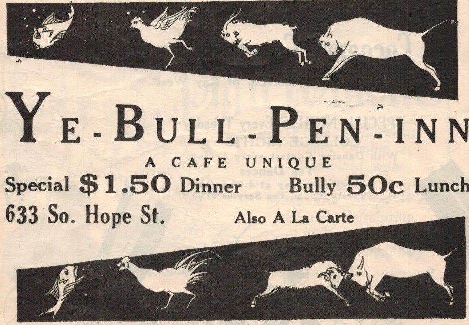 The Ye Bull Penn Inn restaurant had several homes but in 1926 it was here- at 633 S. Hope Street, where it had been serving fish, chicken and charbroiled steaks in a rustic, masculine setting since 1920.