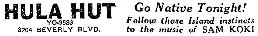 8204 Beverly Blvd. as the Hula Hut c. 1937. That looks suspiciously like the roof sign from the Hope St. Bull Pen. Even the roof tile could be the same. It may have well been salvaged, as 633 S. Hope was in the path of the Wilshire Blvd. extension into downtown in 1931. Hula Hut photo: LAPL.