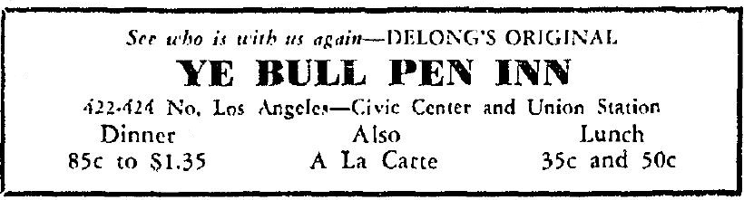 In May 1939 the DeLong’s Ye Bull Pen Inn surfaced again at 422-424 N. Los Angeles St. near the newly opened Union Station, but it seems to have faded away again by the end of the year.