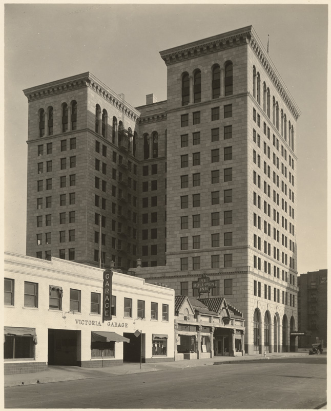 The Ye Bull Penn Inn c. 1926, dwarfed by the brand-new Pacific Finance Company Building at 621 S. Hope St, designed by Curlett & Beelman in 1925 before Wilshire Blvd. was extended into downtown here. CSL