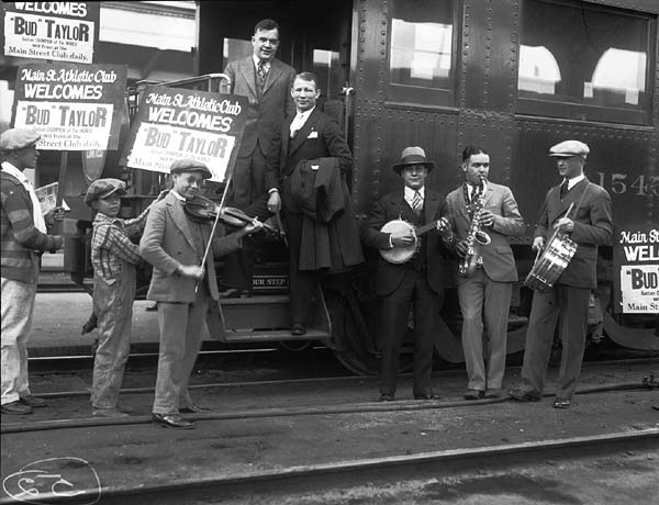 The Main Street Gym band and newsie supporters welcoming boxer “Bud” Taylor at the train station. LAPL