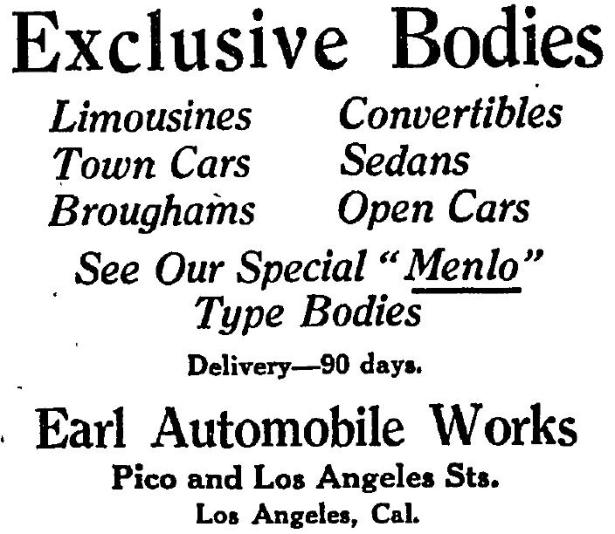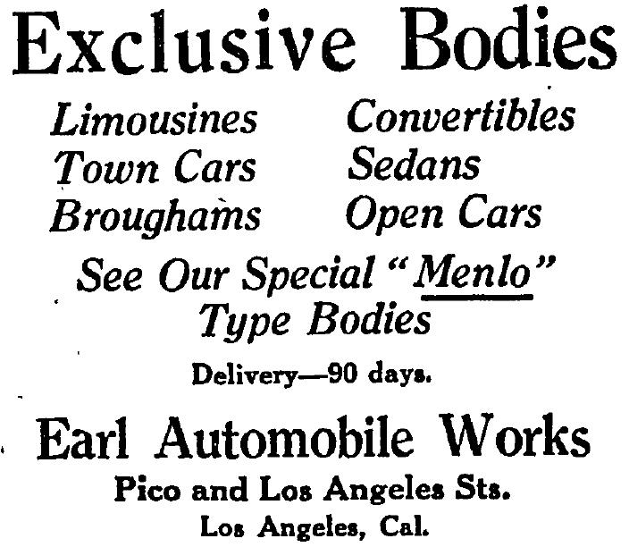 1917 ad for the new Earl Automobile Works garage at 1257 S. Los Angeles St. at Pico, managed at the time by Harley Earl. Cadillac dealer Don Lee bought out the company in 1919. “Exclusive bodies” gave way to Boddy exclusives as building went on to house the Illustrated Daily News.
