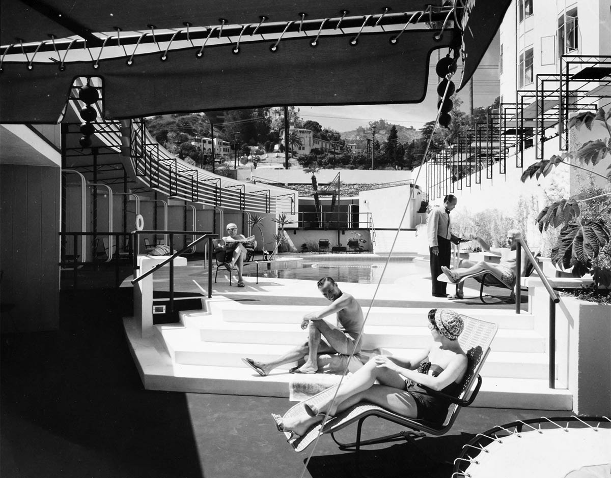 In 1955, the apartment tower underwent an extensive remodeling by architects Palmer & Krisel. A pool and cabanas, added on the west side of the property, opened in September 1956. An annex, further downhill, known as Sunset Towers West (8400 Sunset Blvd.) got underway the same year.