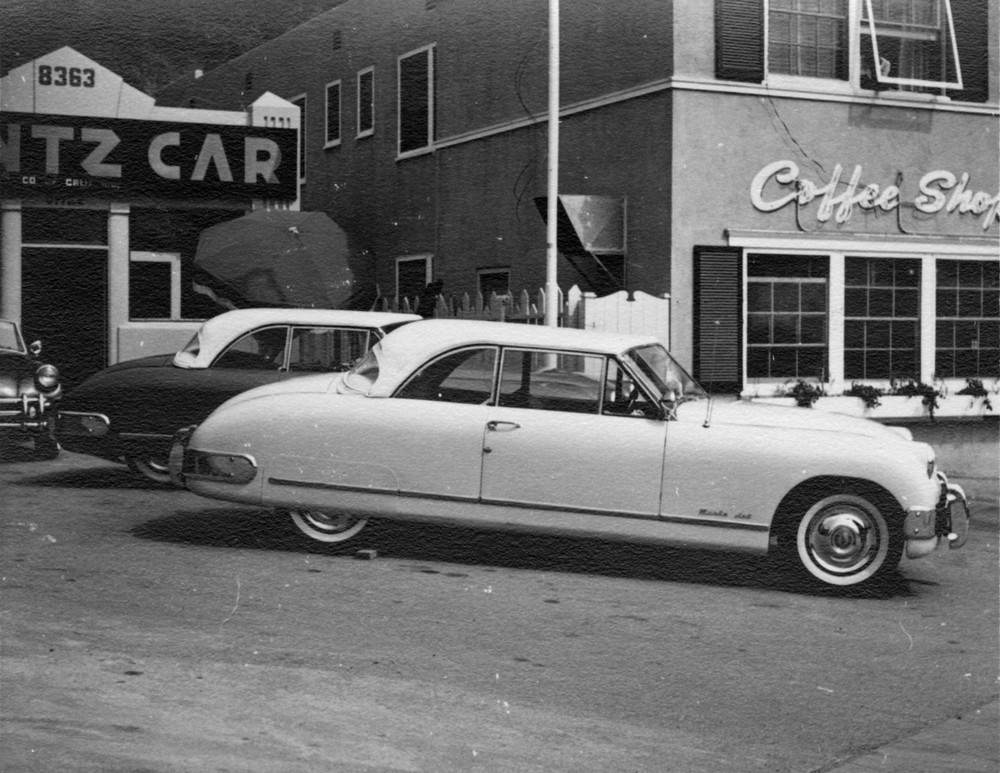 8383 Sunset as the Muntz Car Co., early 1950s. The building next door is the Colonial Hotel at 8351 Sunset, built in 1950. Photo: blog.hemmings.com