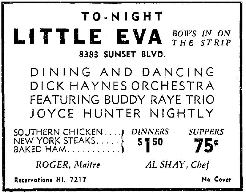 On July 6, 1939, 8383 Sunset made its bow on the Strip as “Little Eva.” It didn’t last long. October 26, 1939 saw the grand opening of The Sports Circle.