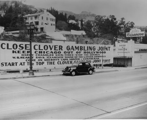 “Keep Chicago out of Hollywood- Close Clover Club Gambling Joint.” Anti-gambling signs on a vacant lot owned by Bob Coyne, adjacent to the Casanova Club, 8383 Sunset Blvd, c. 1937-1938. Previous anti-vice signs with a similar message located on other Coyne vacant lots at 8381 and 8373 Sunset (site of Club Ballyhoo) mysteriously caught fire in the wee hours of August 27, 1933. LAPL.