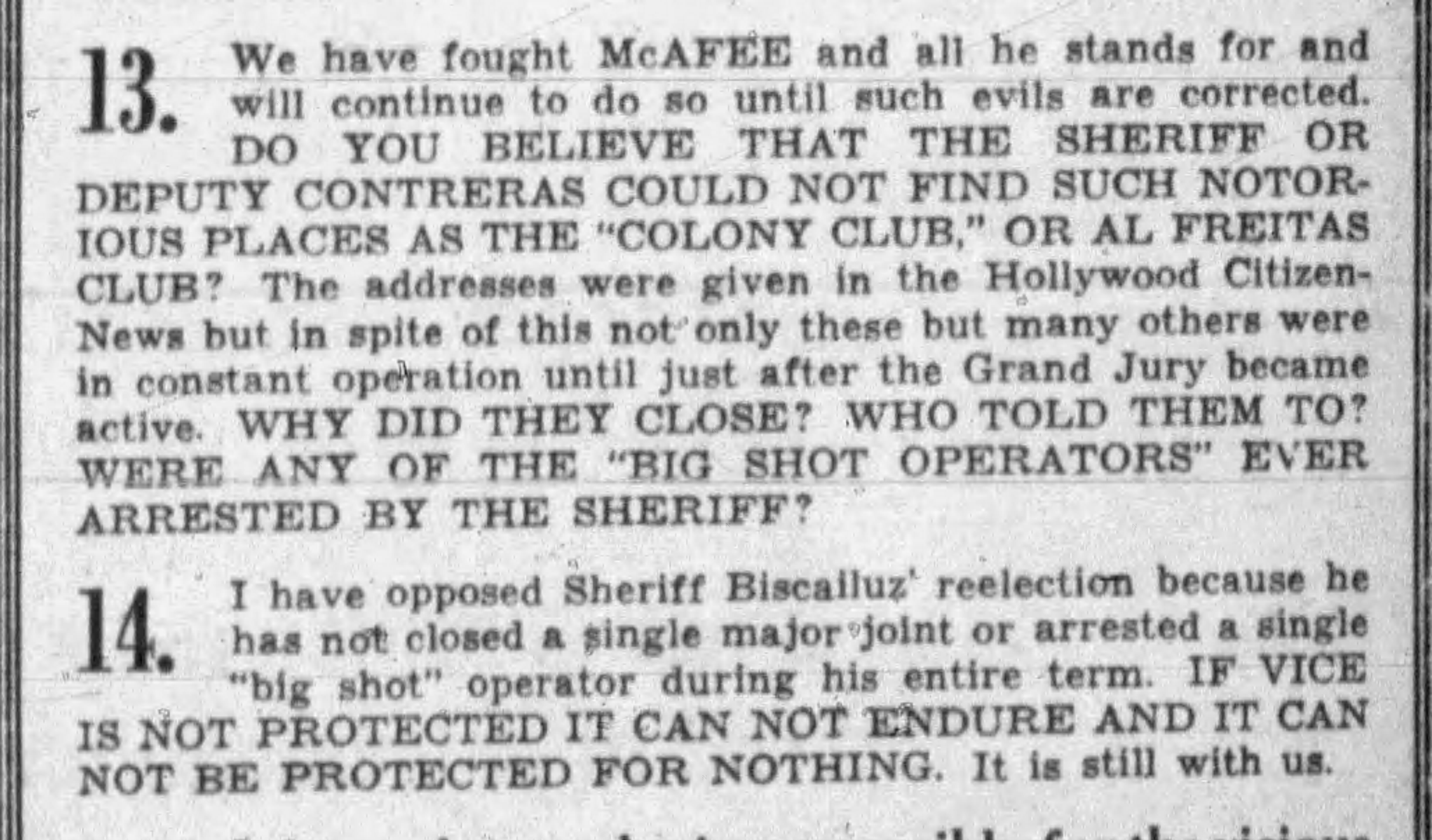 In June 1933, as Sheriff Biscailuz was ordering his newly organized vice squad, headed by Captain Walter Hunter and George Contreras, Coyne launched a citizen-led anti vice campaign in the West Hollywood (then unincorporated) section of the Sunset strip and erected anti-gambling, anti-Clover Club billboards on the Casanova Club property during this period, replacing earlier ones that had been burned. Enlisting the help of ministers and other Hollywood civic leaders, he complained to DA Fitts that protected vice was flourishing in the county thanks to ex-Charles Crawford syndicate figures like Guy McAfee and Farmer Page. Contreras shrugged it off as sour grapes, asserting that one group of racketeers affiliated with Coyne had duped the ministers and other concerned citizens and were merely trying to use the sheriff’s office to raid and shut down their competition. This was classic gaslighting from Contreras and did not address the basic fact that vice did indeed flourish on his supposed watch.