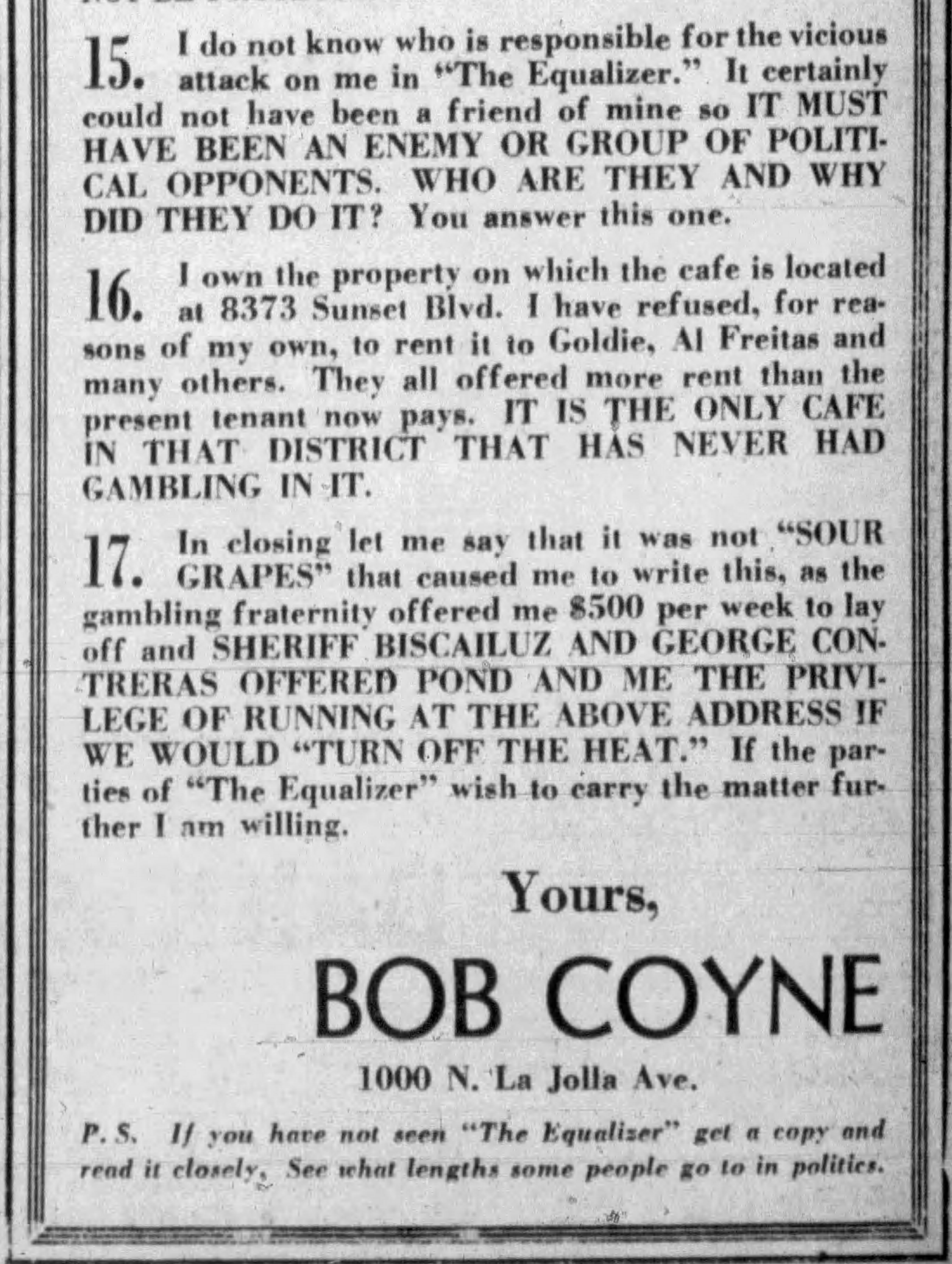 The underworld went on the offensive, attacking Coyne both figuratively (by printing his past arrest records and accusing him of setting the fires at his Sunset properties himself) and directly (furnishing his name and photo to mobsters). Coyne responded by taking out a lengthy ad in the Hollywood Citizen-News on August 21, 1934, in which he was not quite straightforward about his past arrests. The high turnover at his Sunset Boulevard properties does indicate, however, that these were not protected establishments.