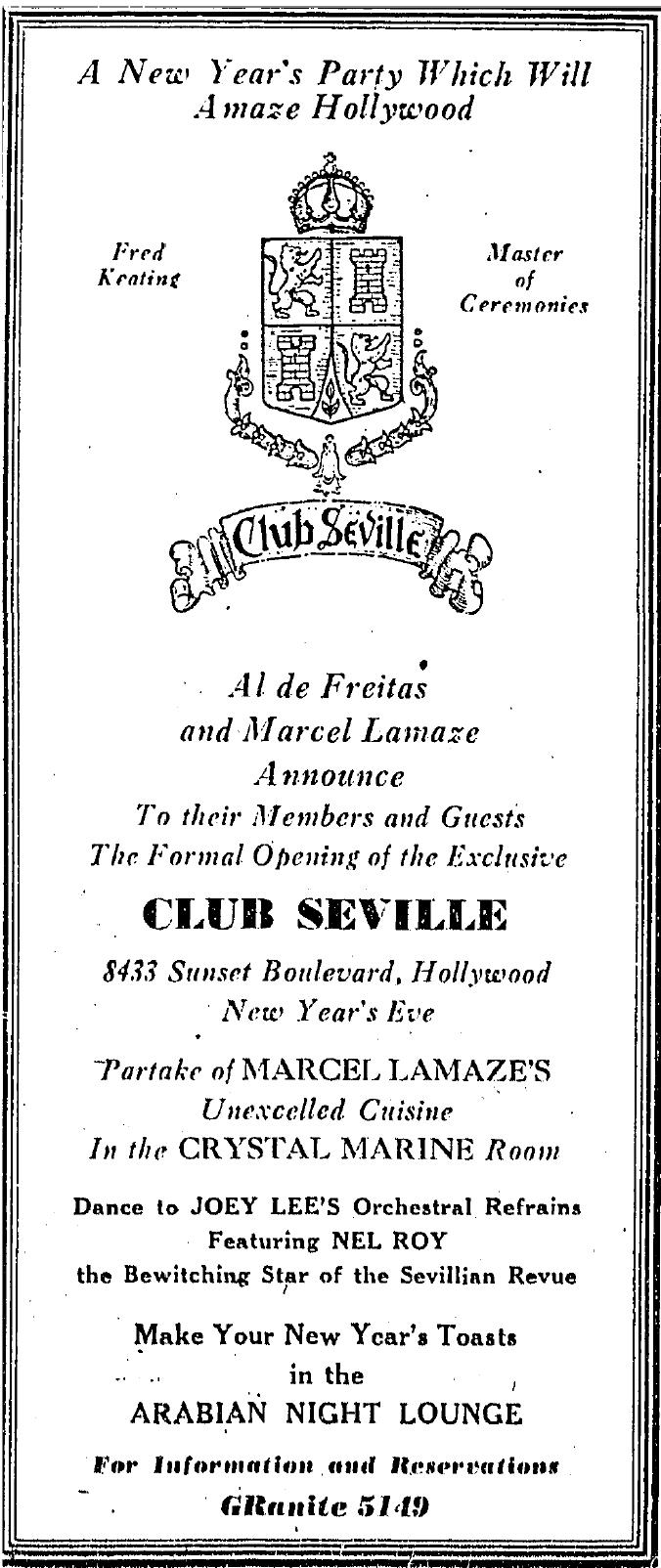 Though it became world-famous as Ciro’s, 8433 Sunset Strip already had an interesting history. The first nightspot to occupy this site was Club Seville, opened New Year’s Eve 1935 by 12-31-35 Marcel Lamaze and Al “de Freitas” (Alfred B. Freitas). Both had long associations with Sunset Strip clubs: Freitas had run a previous Club Seville at 8428 Sunset that was raided during Prohibition; LaMaze, lately arrived from Miami by way of New York, would have ties to 9039 Sunset as well as the Clover Club at 8477 Sunset. The highlight of Club Seville was its Crystal Marine Room, featuring a crystal dance floor with subsurface fish, fountains and colored lights.