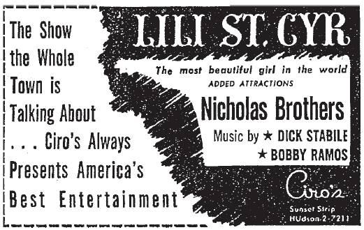 “The Show the Whole Town Is Talking About.” Lili St. Cyr was back at Ciro’s following her arrest. 10-25-1951.