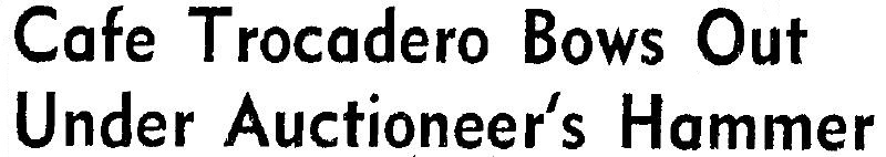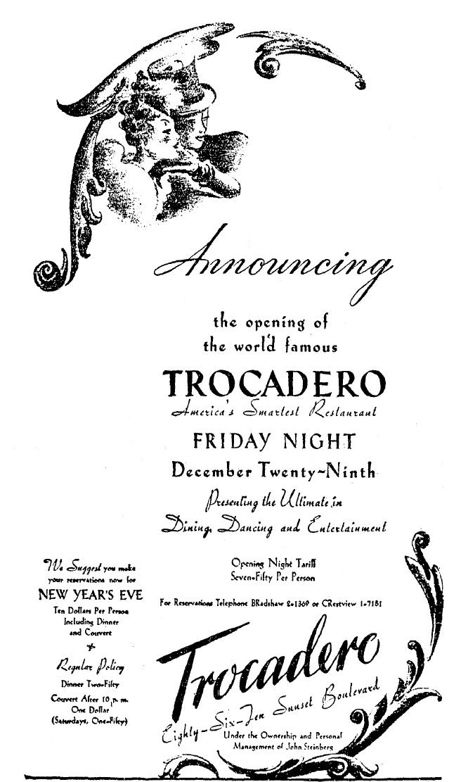 Various reasons for the Trocadero’s decline have been suggested, such as the loss of the so-called Wilkerson touch, or association with gamblers and illegal gambling. But Wilkerson’s leaving didn’t hurt Ciro’s any, and multiple raids of the Clover Club’s gambling rooms failed to diminish its popularity. The whims of Hollywood favor and poor management are just as likely culprits. In any case, the last few years of the Trocadero’s existence were marked by a succession of owner-managers.