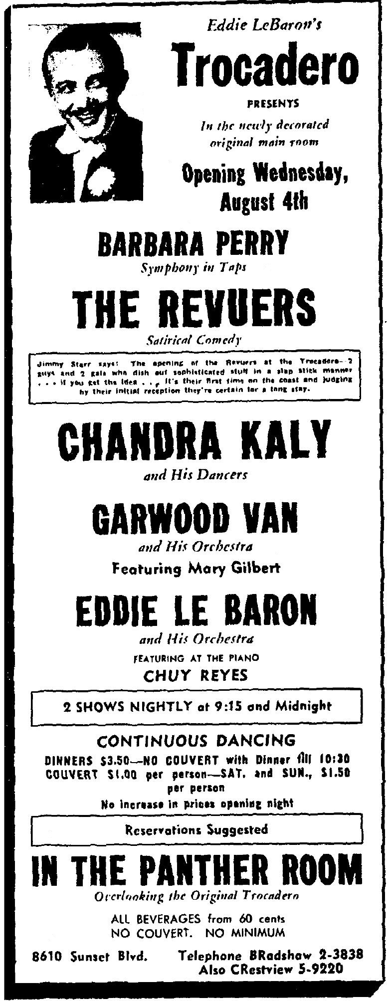 The building sat vacant until April 1943. That month, Hedda Hopper reported that the “old Trocadero” was to reopen on the 15th. Though slightly off in her facts as usual, the club did indeed reopen, on April 21, with Louis Cantone as manager. Then it closed again, reopening August 4, 1943 as bandleader “Eddie LeBaron’s Trocadero.” LeBaron (Eduardo Gastine), however, was inducted into the Army in December and reported for duty in early 1944. In his absence, the Trocadero management passed to restaurateur Glenn Billingsley in March. As of July 1944 it was run by George Goldie, a gambler once associated with the Clover Club in its earliest days.