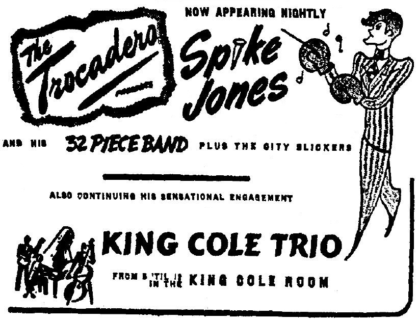 The Trocadero continued to book popular acts into 1946, with Chuck Landis was advertised as manager as February. Spike Jones appeared in March, with the King Cole Trio in the lounge, now “the King Cole Room.” Norman Strollers was the asserted owner in July when the club faced charges from the SBE that it had sold liquor after hours, and Nathan Zukerman was named as manager at the time of a robbery the same month. Around October 1946, the “Chip Corporation” allegedly took out a 15-year lease on the property at $1600 a month, investing a reported $45,000 in redecorating and booking Brazilian Bombshell Carmen Miranda for an exclusive engagement, which never came off. (3). The Trocadero closed for good in 1947.