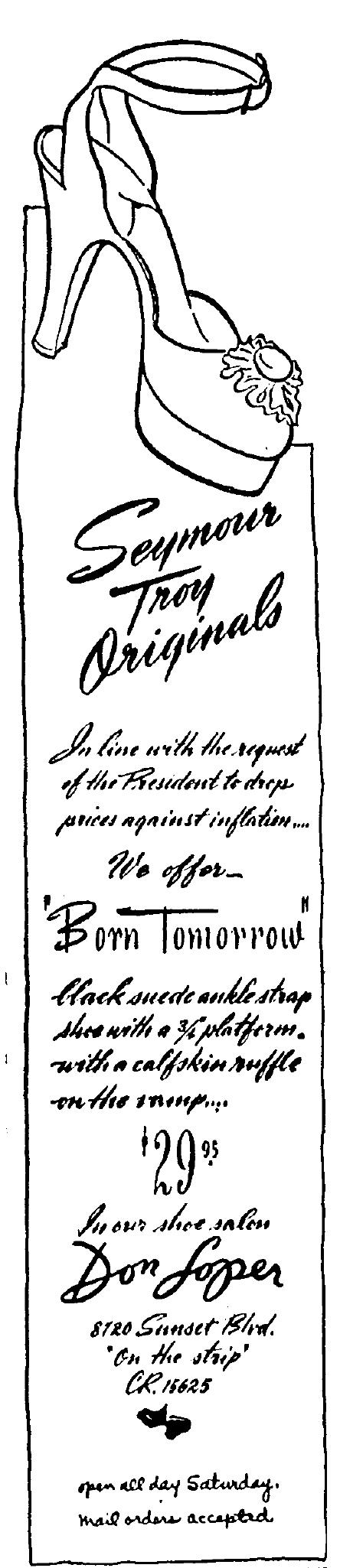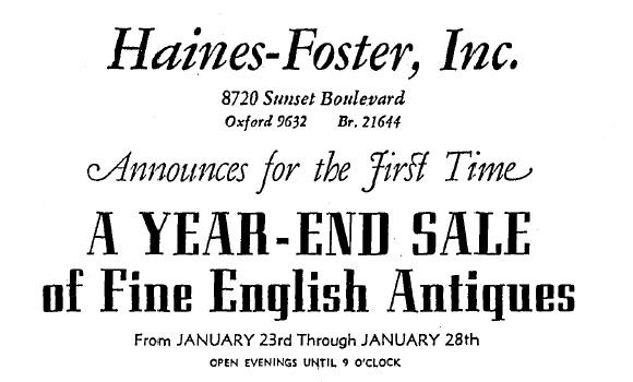 Actor turned interior decorator-to-the-stars William “Billy” Haines operated the Haines-Foster antiques and interior decoration shop with partner Alfred Forster here as of 1936. Haines worked on the interior decoration of the Mocambo at 8588 Sunset. He was a solo act by 1945 and closed the business here in December of that year. In October, 1946, 8720 Sunset Strip became the salon of designer Don Loper who remained until moving to Rodeo drive in 1950.