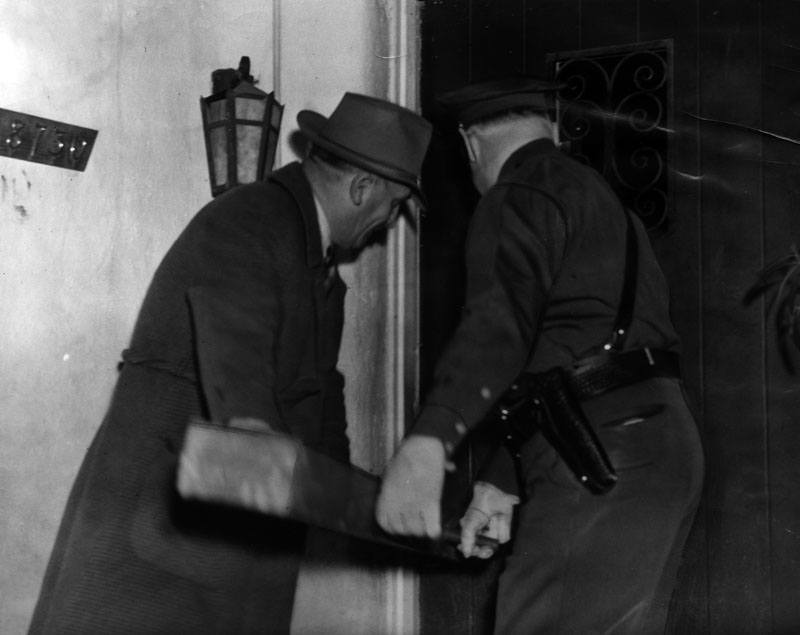 Dep. Sheriffs Capt. Joe Vigneau and Al Wolff breaking down the door of Club Marcel, 8730 Sunset Blvd, in an early morning raid November 27, 1941. LAPL (misdated September 27).