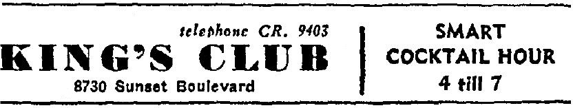 The King’s Club was popular with the movieland celebrity crowd, many of whom were present when it was raided by Sheriff’s vice squad deputies on May 13, 1934 for liquor violations. George Rangold was its asserted proprietor. In March 1935, the Kings was one of several prominent Hollywood clubs, including the Trocadero, to face hearings on the possible loss of their liquor licenses for disregarding the state 2a.m. closing law. Kings and the other prevailed but on September 1, 1935, patrons were both “alarmed and amused” when it was raided again by the sheriff’s men for selling booze after hours. Bruce Knox, the asserted owner, was arrested.
