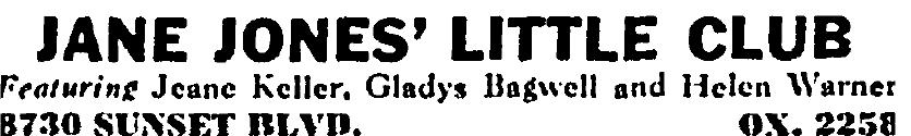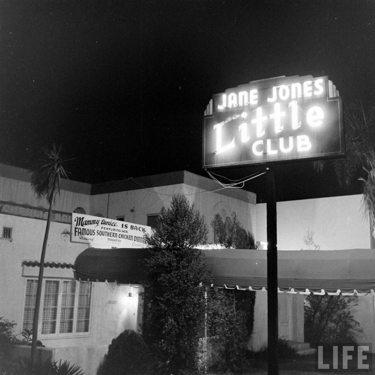 By May 1936 it had become Jane Jones’ Little Club, still popular with the film-crowd and still being raided on occasion. On September 2, 1939, sheriff’s deputies, wearing tuxedos to blend in with the well-dressed crowd of 50 patrons, slipped in quietly and arrested Jane Jones herself and co-owner Raymond P. Babcock for violating the 2 a.m. closing.