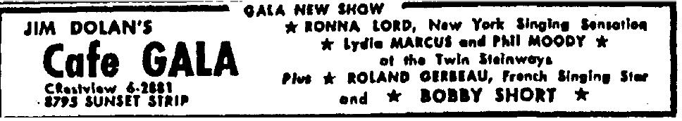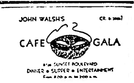 Perched on a sloping lot above street level in a former Spanish-style residence, Café Gala was opened by John Walsh in September 1941 and gained a following among the Hollywood supper club crowd (1). One of the quieter nightspots on the Strip, it only had one brawl of note, in August 1948 when a rowdy patron, who earlier in the evening had shared a table with Shirley Temple and husband John Agar, refused to pay his check. James (Jim) Dolan, who had taken it over by that time, called the police. When reached for comment, Miss Temple said “I’m glad we left when we did.”