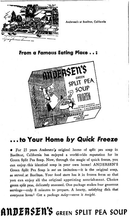 View of 8804 Sunset c. 1947 when gangster Mickey Cohen operated his haberdashery “Michael’s” here. Utter-McKinley Mortuary (8814 Sunset) can be seen mid-block. Bublichki Russian restaurant (8846 Sunset) is further up, near the rooftop billboard advertising frozen Split Pea Soup from the Buellton-based Andersen’s restaurant, a product introduced in the fall of 1946.