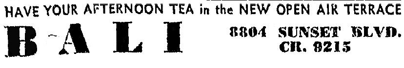 The unassuming streamline-moderne building at 8804 Sunset began as a nightclub. In 1935 it was the Three Star Club and raided for selling liquor after hours. By the spring 1937 through spring 1939, it was “Bali,” a tropical-themed café-nightspot popular with the Hollywood film crowd, who crammed in to hear its featured singer, Bruz Fletcher (B. Stoughton Fletcher). In 1941-1942 it was Club Society and raided a couple of times for liquor violations.
