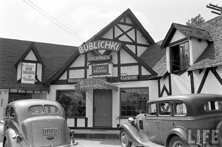 Bublichki, 8746 Sunset Blvd. c. 1937. Small shops occupied the other spaces in the old-world style building. Life Magazine.