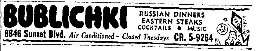 Founded by actor Alex Danahoff, Bublichki, with its flaming meats, vodka cocktails and gypsy violinists occupied this old world-style building from 1936 through 1958.
