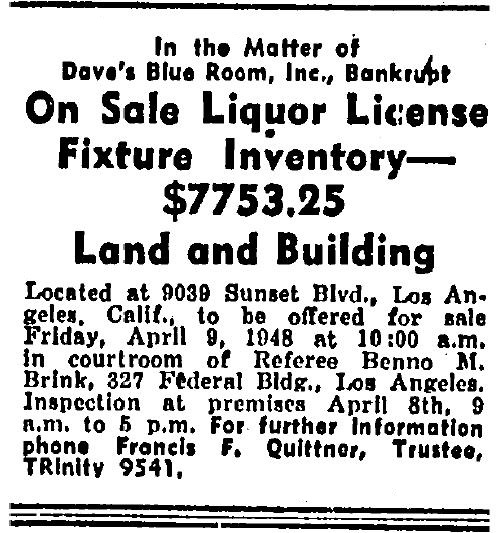 This address had a long Sunset Strip history before Dave Kleckner of Dave’s Blue Room in New York, opened here in late 1943.
