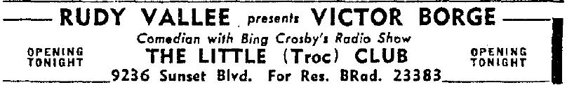 On May 26, 1938 it opened as Club Morocco but by Oct 1938 it had become Jerry’s Mandaly (affiliated with the famous Jerry’s Joynt restaurant in Chinatown) and as of February 4, 1939 it was Neville Fleeason’s Mandaly and raided for liquor violations in October. In 1940 it operated briefly as The Sphinx Club run by George Goldie, a gambler once associated with the Clover Club at 8477 Sunset, which had once been known as The Sphinx Club itself. As of June 25, 1941 “Gogi” announced that it would be doing businesses as the Garden at Scheherazade. In early 1942, Felix Young, formerly affiliated with both the Trocadero and the Mocambo, the opened the “Little Troc” Club (or Little Club) here and was raided for after-hours liquor sales in 1943.