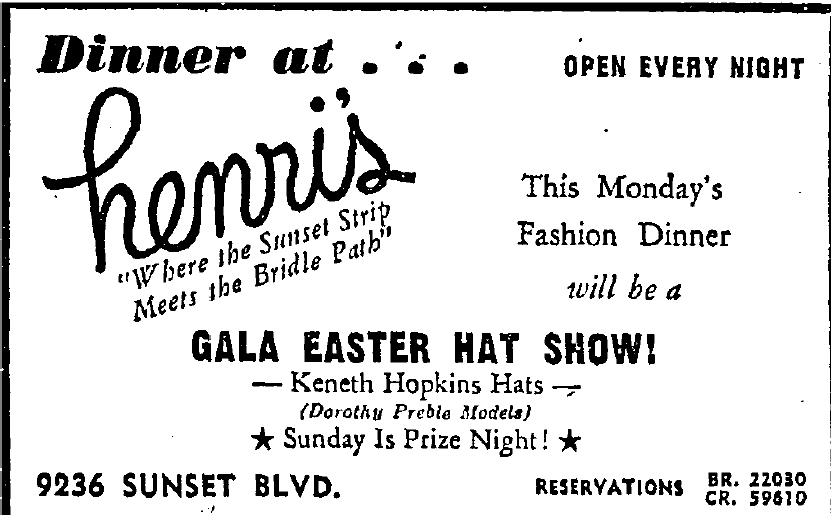 “Where La Path Equestrian Meets La Sunset Strip,” June, 1946 ad for Henri’s on the Strip. Palm Springs Desert Sun. Until just recently it had operated as Eddie Nealis’ Colony House.