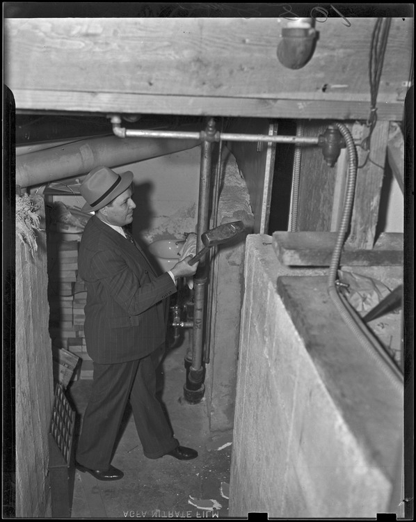 William Jolin with his trademark sledgehammer, breaking into a basement bookie joint. UCLA photo. Published in the LA Times 12/17/1938.