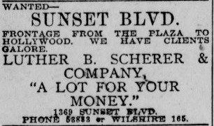 Tutor would also tell friends that he quit school to follow his wanderlust leanings. He joined in the gold rush to Rawhide, Nevada, where gold and silver ore deposits were discovered in 1906. There, he learned to play Faro Bank and left broke. Back in California, across the bay from earthquake-damaged San Francisco, he established a chain of cigar stores in Oakland, and served as a bookmaker at the Emeryville race track before returning to Los Angeles. By the early ‘teens, Scherer had a thriving real estate business with offices at 1369 Sunset Blvd. and a catchy slogan: “A Lot for Your Money!”
