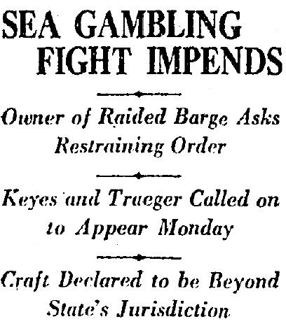 Tutor came out of the shadows to identify himself as the owner, and sued L.A. County D.A. Asa Keyes and Sheriff Traeger for the raid, arguing that the ship, anchored 3½ miles offshore, was outside the jurisdiction of their jurisdiction. It was an argument that would play out in court multiple times for years to come.
