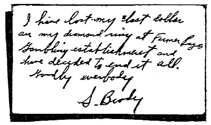 Brody thoughtfully penned this “suicide” note before whipping out his pistol at 120 W. 3rd. St. “I have lost my last dollar and my diamond ring at Framer Page’s Gambling establishment and have decided to end it all. Goodby everybody. S. Brody” 10-21-1924.