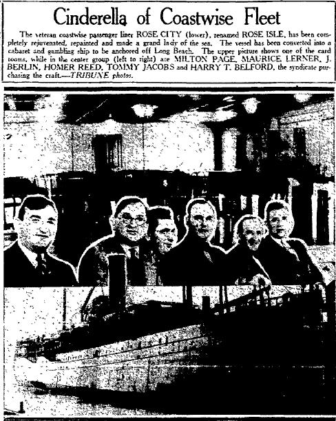 In October 1930, it was announced that Page and Tommy Jacobs, the onetime witness in Page’s shooting death of Al Joseph, and others had purchased the passenger liner Rose Isle and were outfitting her as a “floating Monte Carlo.” Two months later, the Rose Isle figured into the botched kidnapping of Zeke Caress. The D.A., Buron Fitts, used the incident to raid the ship and claimed to have found a stash of machine guns. Page’s old Spring Street associate Tutor Scherer was also said to be invested in the Rose Isle, which suffered more bad publicity in August 1932 after a murder occurred on board.