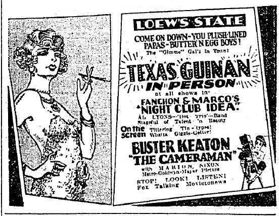 Texas Guinan personal appearance at the Loew’s State. “Come on down you plush lined papas- Butter ‘n egg boys!” 10-14-1928. Los Angeles Times.