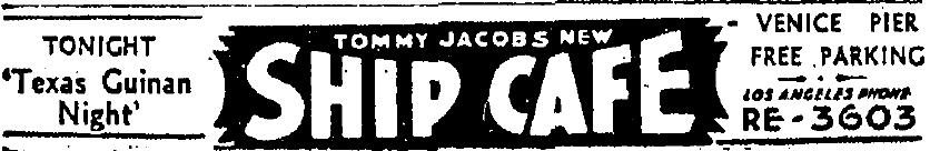 Nor had Hollywood forgotten an old friend: Tommy Jacobs hosts “Texas Guinan Night” at the notorious Ship Café in Venice, 9-12-1933