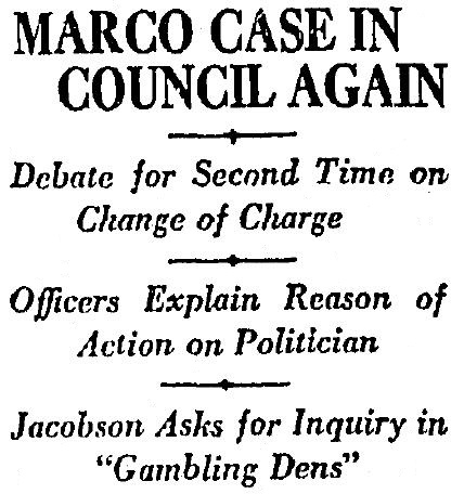 Councilman Jacobson took the opportunity of the next City Council meeting to crow about Marco’s arrest, noting that he had repeatedly complained to the Police Commission about Marco’s barroom with no results. At the meetings of August 3 and August 4, 1927 he proposed a Council Resolution commending the prohibition agents for the raid on Marco, and pressed for a police investigation into a gambling club he alleged was being run by Farmer Page.