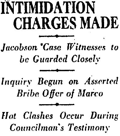 Albert Nathan testified that he’d seen the councilman seated on the bed and heard him rambling on about being “ruined” and having walked into a “trap.” Nathan also said Jacobson spoke with him about wishing there was some way to “fix up” the case. Nathan later testified that he’d advised Jacobson against a “bribe,” if that was what he meant.