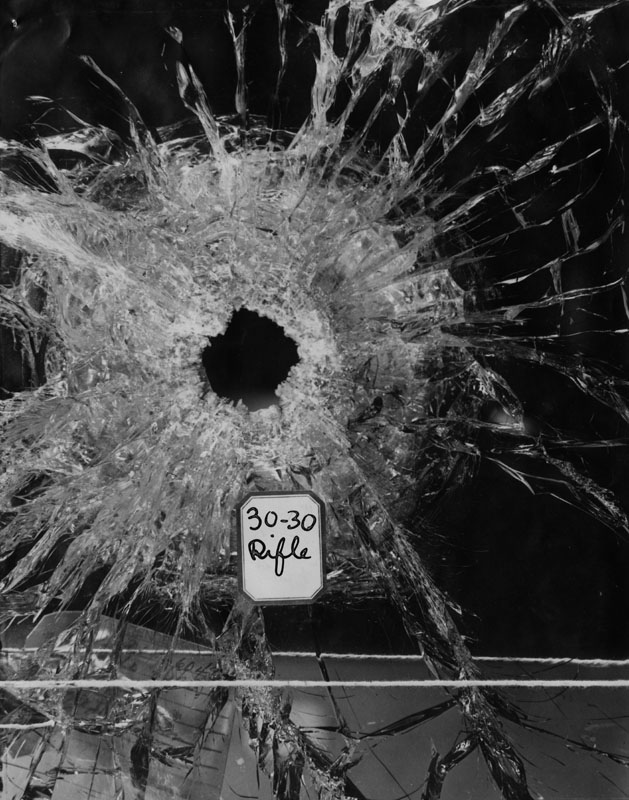 Bulletproof glass from Mike Pupillo and Vito Ardito’s armored car, tested at the Augie Palumbo murder trial, 7-27-1927. LAPL.
